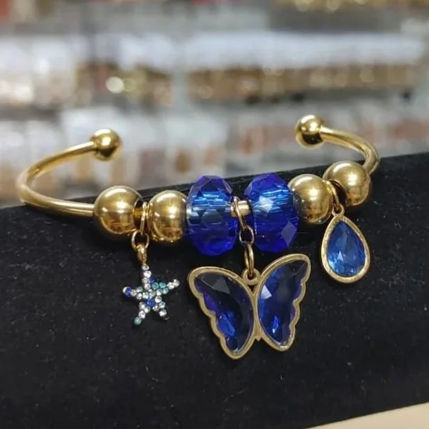Pulsera dorada con cuentas verdes y dijes de búho, libélula y ave